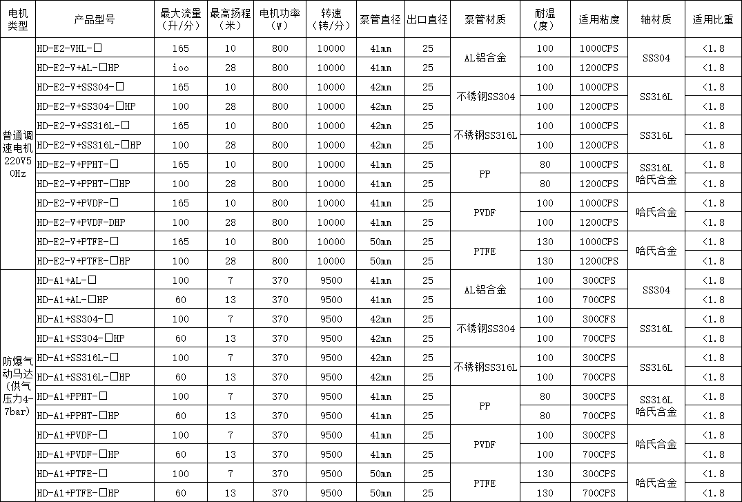 HD系列電動抽油泵根據所輸送的液體性質,泵體沾濕部分材料可選用鋁合金、優質不銹鋼,增強聚丙烯等組成。驅動電機配備單相標準電機,防爆電機,高轉速電機等多種選擇。電機外殼采用優質PC聚碳合成塑料,根據所配置泵體材質和電機的不同,型號可分為三大系列10種型號,該系列泵可按防爆區域和非防爆區域選用,如在易燃易場合使用,可選用我公司生產的防爆型電動抽液泵。使用防爆型電動抽液泵時應正確使用防爆插頭插座。RPP塑料:非較性、無污染、有耐酸堿鹽類等腐蝕性化學液體。工作溫度:-14~100℃。